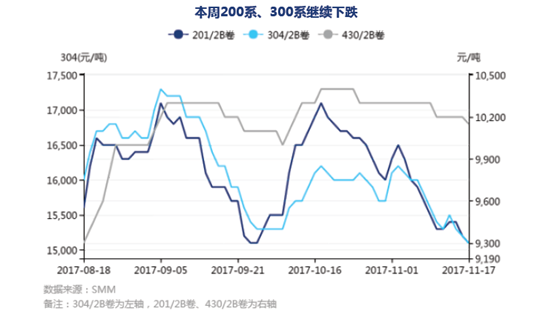 代理商對(duì)不銹鋼后市態(tài)度偏悲觀,向鋼廠提貨謹(jǐn)慎;同時(shí)臨近年底資金面抽緊,資金面制約代理商大量提貨, 200系、300系不銹鋼價(jià)格重心下移。