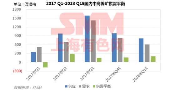 2017年4季度國內(nèi)中高鎳礦維持供應(yīng)過剩,而2018年1季度情況加劇,供應(yīng)過剩209萬濕噸,SMM預(yù)計(jì)鎳礦價(jià)格仍弱勢。