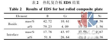 對(duì)熱軋后芯層中的硼化物及復(fù)合板界面處進(jìn)行了eds分析,結(jié)果如圖3及表2所示。芯層中硼化物的b含量達(dá)到42.72%,原子分?jǐn)?shù)達(dá)到79.23%,根據(jù)fe-b二元相圖[8],判斷該物相的成分中含有fe2b相。芯層中的硼化物除含有較多的fe 外,還含有一定量的cr、ni。cr元素由于是易形成碳化物的元素,而且具備生成cr-b化合物的熱力學(xué)條件,因此推斷該相中cr的存在形式有兩種: cr的碳化物和cr2b,綜上可知芯層塊狀硼化物的主要成分為: cr的碳化物,fe2b和cr2b。界面處硼含量較低,但cr含量較高,說明界面處的組織仍主要是α-fe基體相,但界面附近存在有少量由芯層越過界面擴(kuò)散到覆層而形成的二次硼化物。